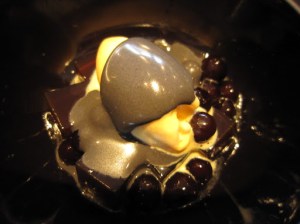 Black beans, kanten and vanilla ice cream with a black sesame sauce