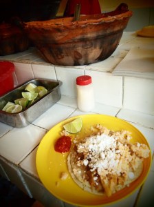 As soon as I arrived at my friend’s apartment in Condesa and put my bags down, I headed out to explore Mexico City. My first stop was Taqueria Hola (the name certainly doesn’t sound convincing but I read about it in the Lonely Planet and it was a few blocks away). I felt like an idiot watching the locals do their thing. Because I only speak a little bit of Spanish and there was a way of ordering and eating the tacos, I was dumbfounded… It wasn’t anything complicated but it was all new to me so I observed for a while before working up the courage to order. I asked for the chicharron con queso but they pork skin they gave me was braised, not fried…? All the stuffing were displayed in clay pots and there were lime wedges, two different chili salsas and sliced onions with jalapenos for people to take themselves. There was an extra tortilla underneath to eat with the excess filling that spills out. The tortillas tasted like corn- I had made them at school before but the tortillas you get in the US (at least in NY) are usually made with wheat flour. I actually find it to be an accustomed taste so I prefer the wheat flour tortillas.
