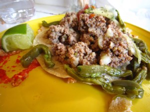 The great thing about a taqueria is that everything can be served fast (faster than fast junk food) so you can keep ordering if you’re still hungry. As I stood by the counter eating my first tacos, I saw the other customers ordering one by one. When I was done with my first, I asked for the picadillo with what looked like cactus (quite slimy looking). The texture was somewhat similar to szechuan pickles.