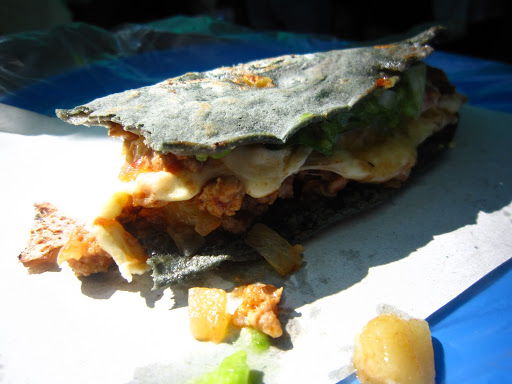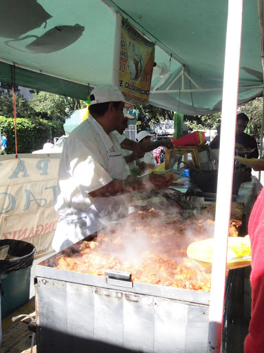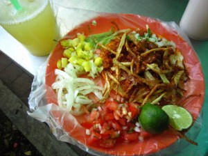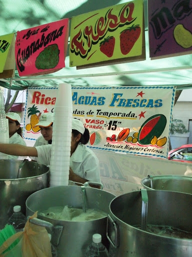 My friend took me to a market near Polanco where we ate breakfast at four different tacos and quesadilla stands. They cost 8 Mexican pesos each (a little less than one US dollar). The plastic plates were lined with plastic bags to eliminate the dishwashing process and payment was made based on an honor system- customers state how many they ate and get charged based on that. Although these stands look homogeneous at first glance, each has unique condiments and provides different cuts of meat prepared using various cooking methods. At one stand, every taco was topped with fried potato strips (that tasted like mesquite bbq…), at another they had pickled radishes with chilies and at another, the only meat they served was from a goat’s head. My favorite at this market was the taco de lengua (cow tongue). Paired with fresh fruit juice, this was easily one of the best breakfasts I’ve had in my life.