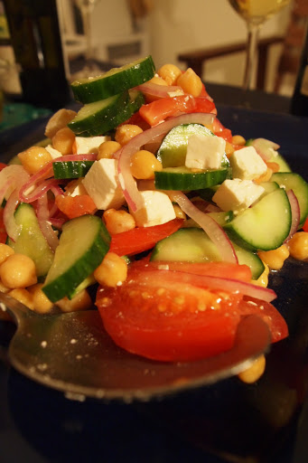 A cucumber, tomato, feta and chickpea salad (lemon and olive oil vinaigrette). Not Italian or seasonal but was craving it!