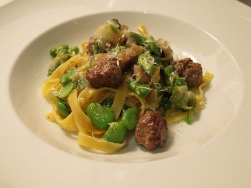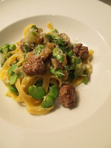 An extremely simple but delicious pasta dish. The ground lamb was seasoned with cumin, coriander, black pepper and salt. After forming them into balls and searing them in olive oil (with a crushed garlic and dried chili pepper), I set them aside and cooked the diced eggplant in the remaining oil and deglazed the pan with a little bit of white wine. As the pasta was close to being slightly firmer than al dente I added the escarole, fava beans (already blanched) and lamb meat balls. Toss in the pasta with pecorino romano and a little bit of butter and finish with some black pepper and more cheese if desired.