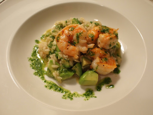 This risotto was actually really good. I used store bought shrimp stock but fortified it with some shrimp shells. The general ratio of rice to liquid for risotto is 1 to 3 but you should adjust it accordingly. As the risotto was nearly done I seared the shrimp (cook all the way). I folded the avocado into the finished risotto. The cilantro oil is simply cilantro and olive oil blended together (you can add garlic if you want). When plating, top with the seared shrimp and cilantro oil.