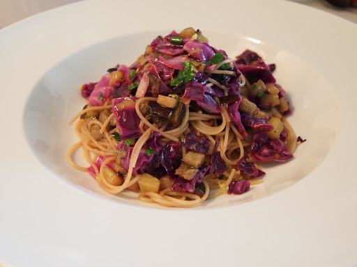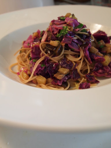 I spent a week in May as a vegetarian just to see how challenging it would be to sustain that sort of diet. Surprisingly, I got through the week and was rather satisfied with most of the meals I had. This was a pasta I made with leftovers. I loved the color of the red cabbage after it faded. I basically sauteed the diced eggplant in olive oil (with a crushed garlic) until tender then quickly sauteed the red cabbage. I tossed in the whole wheat pasta and finished it with some extra virgin olive oil and black pepper.