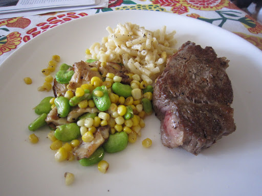 I bought a porterhouse steak, which was not cheap (24 oz for $30). It was too big for me so I cut off the tenderloin and saved it for another time. I wanted to savor the taste of this beautiful piece of grass fed beef so I just seasoned it with salt and black pepper. But I made some chimichurri type sauce as well. It was actually not as beefy as other grass fed beef I’ve had but it was reasonably well marbled and not too lean.
