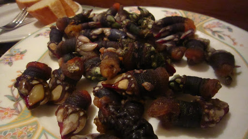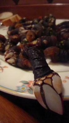 I had wanted to eat gooseneck barnacles since I heard about them about two years ago. They look like turtle feet… These were just steamed- the sea water gave enough salt so no seasoning was needed. I asked the guy working there “como como?” (How do I eat?) and he showed us how it’s done. You bend it in half until the skin breaks and suck out the inside. They were good but not amazing… a little bit disappointing but I was happy to eat them nonetheless!