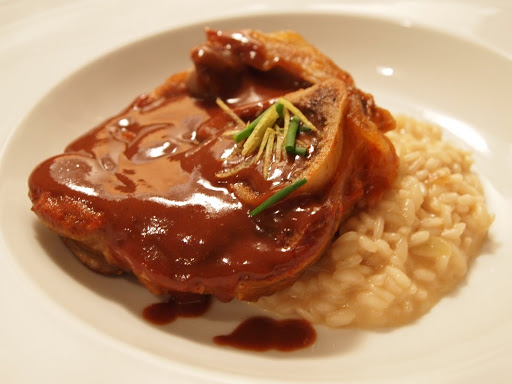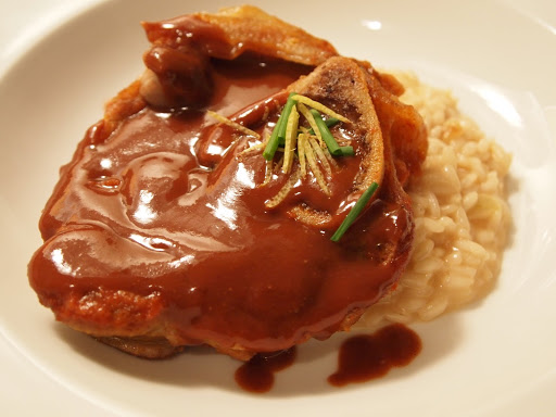 22. Place the risotto in a bowl dish and lean the osso bucco over the side. Cover the osso bucco with the sauce and garnish the top of the marrow with the lemon zest and chives.
