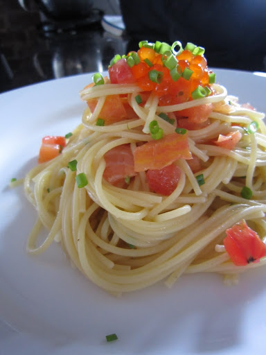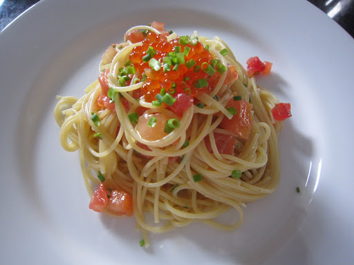 The vinaigrette was basically just lemon juice, olive oil, salt, black pepper and diced tomatoes. Once I cooked the thin spaghetti, I cooled it down with cold water (would’ve done it with some ice but didn’t have any!) and tossed it in the vinaigrette. I then tossed in some pieces of the smoked salmon (tore them into smaller pieces) and garnished the dish with chives and salmon roe.