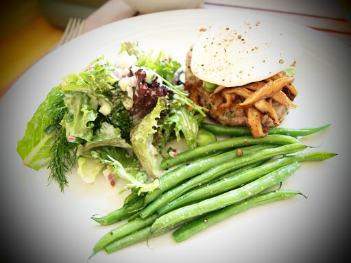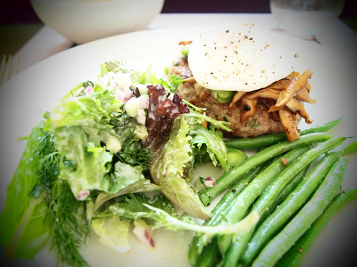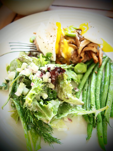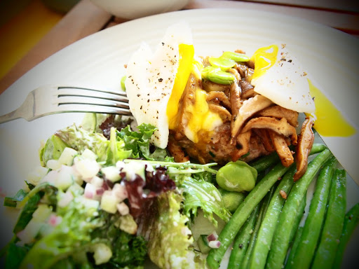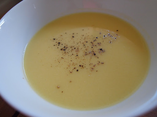 For dinner tonight I made a cold corn soup, rosemary turkey patty (with baby swiss cheese inside) with shiitake and favas, and poached egg, and a herb salad with yogurt dressing. I typically make corn soup with just corn and water but I had leftover chicken stock that I made earlier so I used chicken stock and corn (and salt). All I did was cook the corn kernels in just about enough chicken stock to cover them and once they were cooked through I used a hand mixer to puree them. I then strained it and cooled it down in the fridge.
