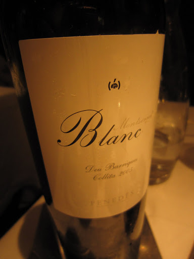 When I saw the outside of the restaurant, I didn’t know what to expect because it looked quite old fashioned and plain. As we walked in, we saw a completely different world inside, with a modern black and white interior. Since it has three Michelin stars, we were really dressed up, but we almost felt overdressed compared to everyone else. We were shown to a table upstairs, and one thing we instantly noticed was that most of the servers were women. We of course chose to have the tasting, and ordered a bottle of Monserrat Blanc (because we had seen the mountain earlier when we were in Penedes), which was like a cross between a chardonnay and viognier (slight oxidized taste).