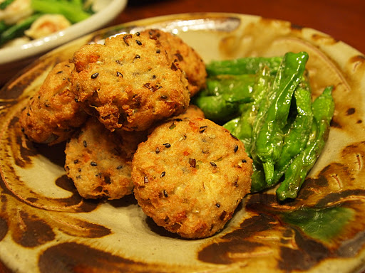 Peel the lotus root and keep in vinegar water for a while (to slow down the oxidization). Grate and drain the liquid. Crumble the tofu (firm) and leave to drain as well. Combine the grated lotus root, tofu, brunoise (or just small dice) of carrot and scallion and toasted black sesame, and mix well. Season with salt, soy sauce and white pepper. Form into disc shapes and deep fry until golden brown.