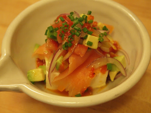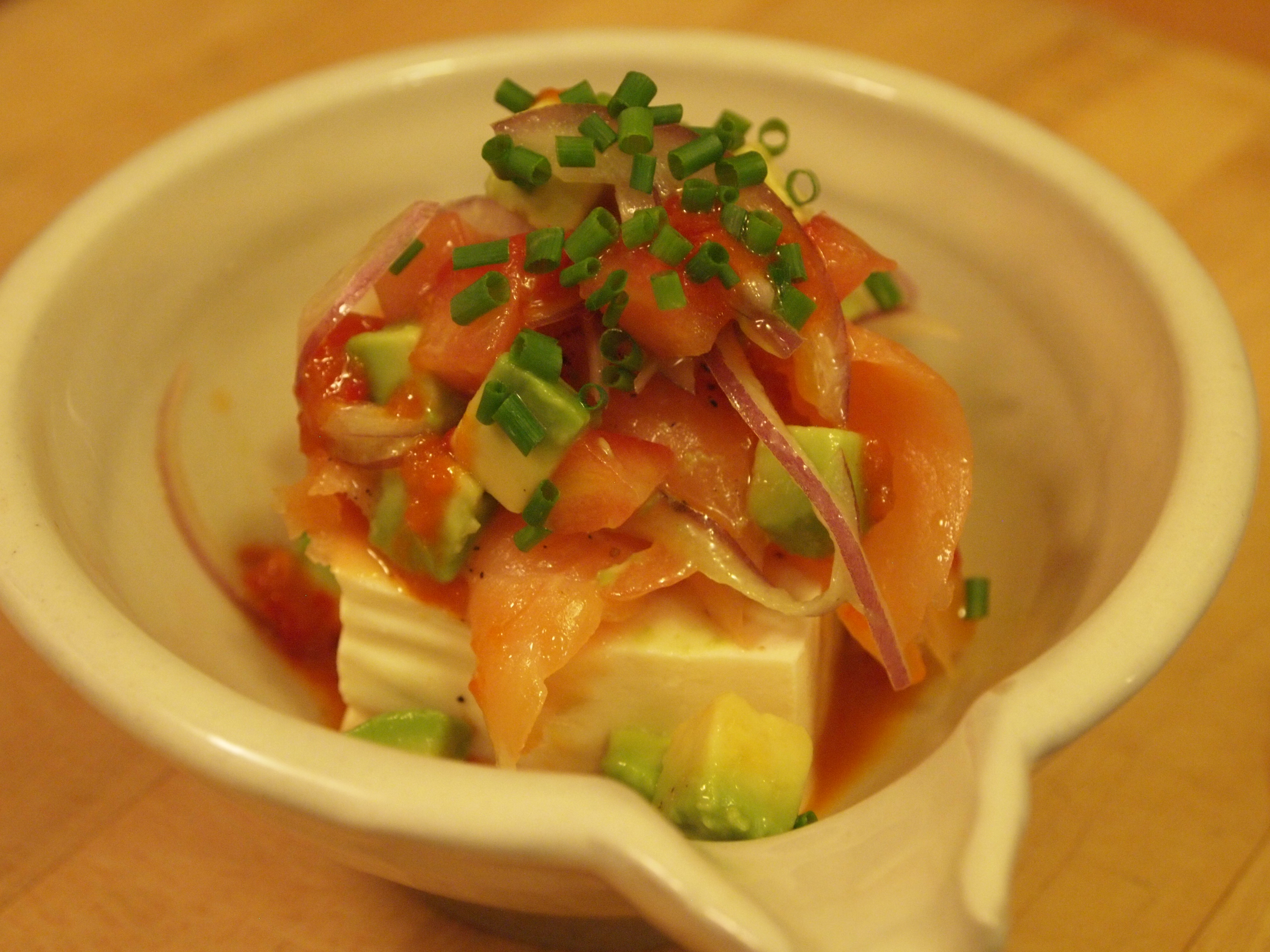 1. Combine the salmon, tomato, avocado, red onion and lime juice and season to taste. Leave to marinate.