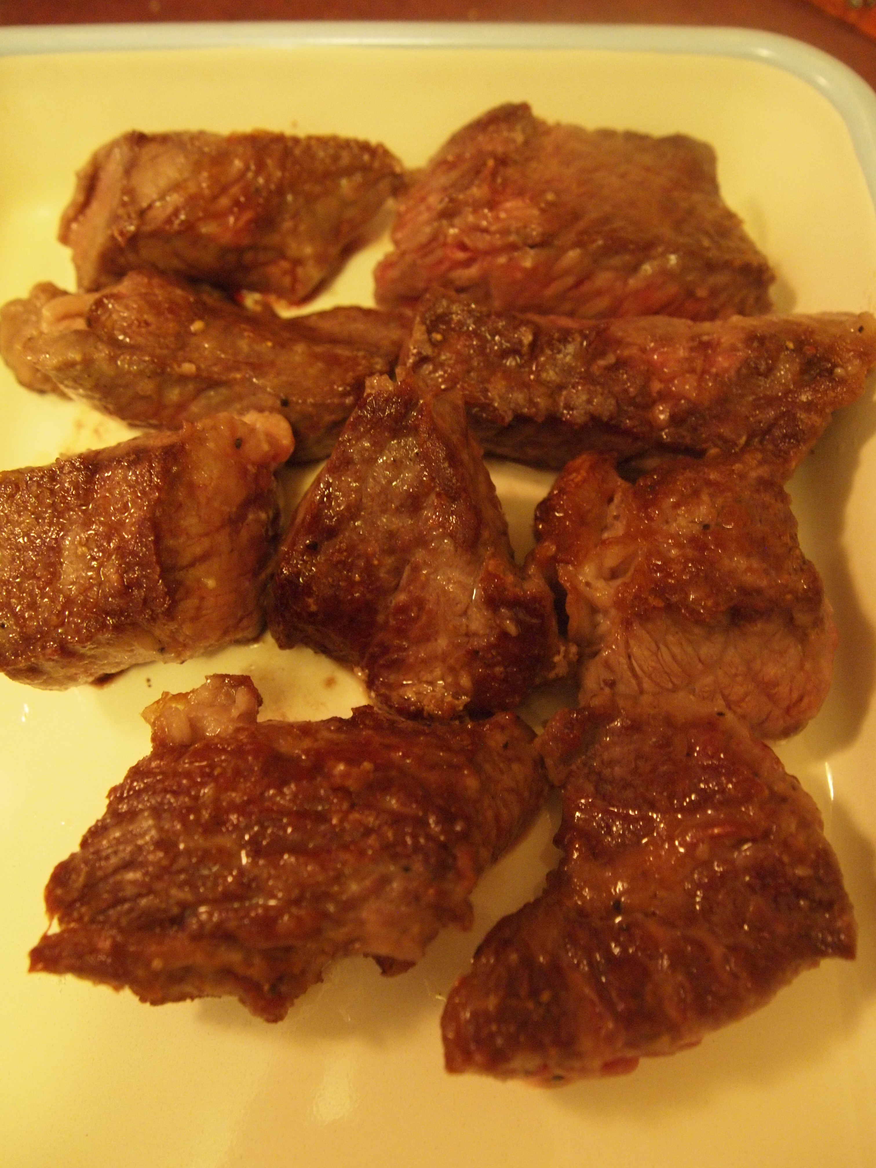 Brown the cubed beef on all sides in some olive oil. I used a little less than 2 pounds, which is good for 4-5 portions. Make sure the pan is really hot (a shallow pan is better for this, to prevent steaming and no browning) to get a nice development of fond (the brown stuff that sticks to the pan and contains a lot of umami/flavor). Sear the beef in batches because if you crowd them, they will steam and not develop a nice brown color. There is no need to cook them all the way through- just sear the surface.