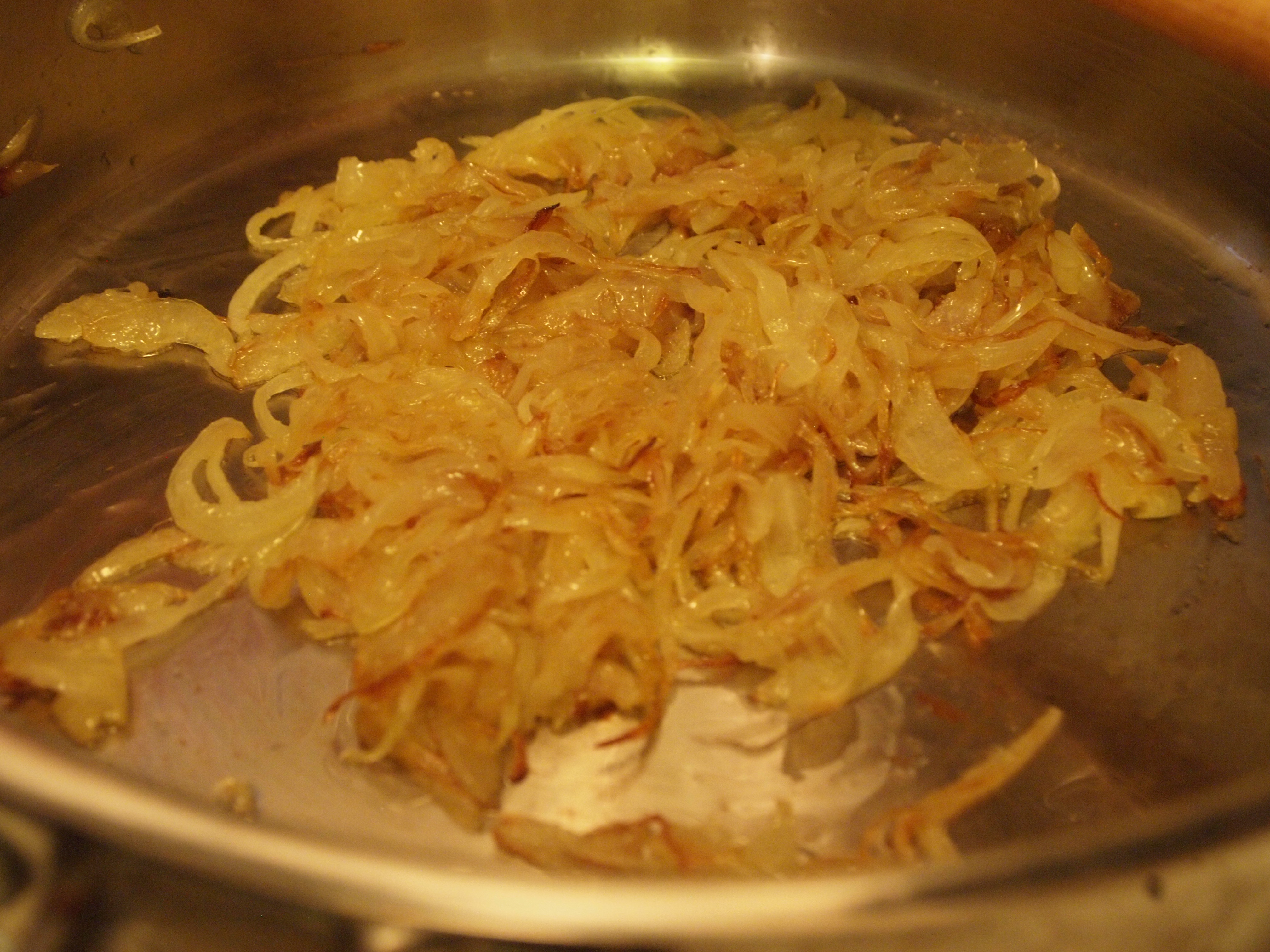 Slice two medium-large onions and caramelize them with some olive oil. Keep the heat low so they don’t burn. It takes time to get these a nice golden color but they become so sweet and flavorful (water evaporates and you’re left with a concentration of delicious onion flavors). Add minced garlic (2 cloves), hot Hungarian paprika (4-5 tablespoons- more if you prefer), chili powder (1 tablespoon- but more if you want it spicier), dried marjoram and bay leaves. Add the beef and mix well. Add enough beef or veal stock to just cover the beef. Bring to a boil and then reduce to a simmer. Skim the surface of all the scum.