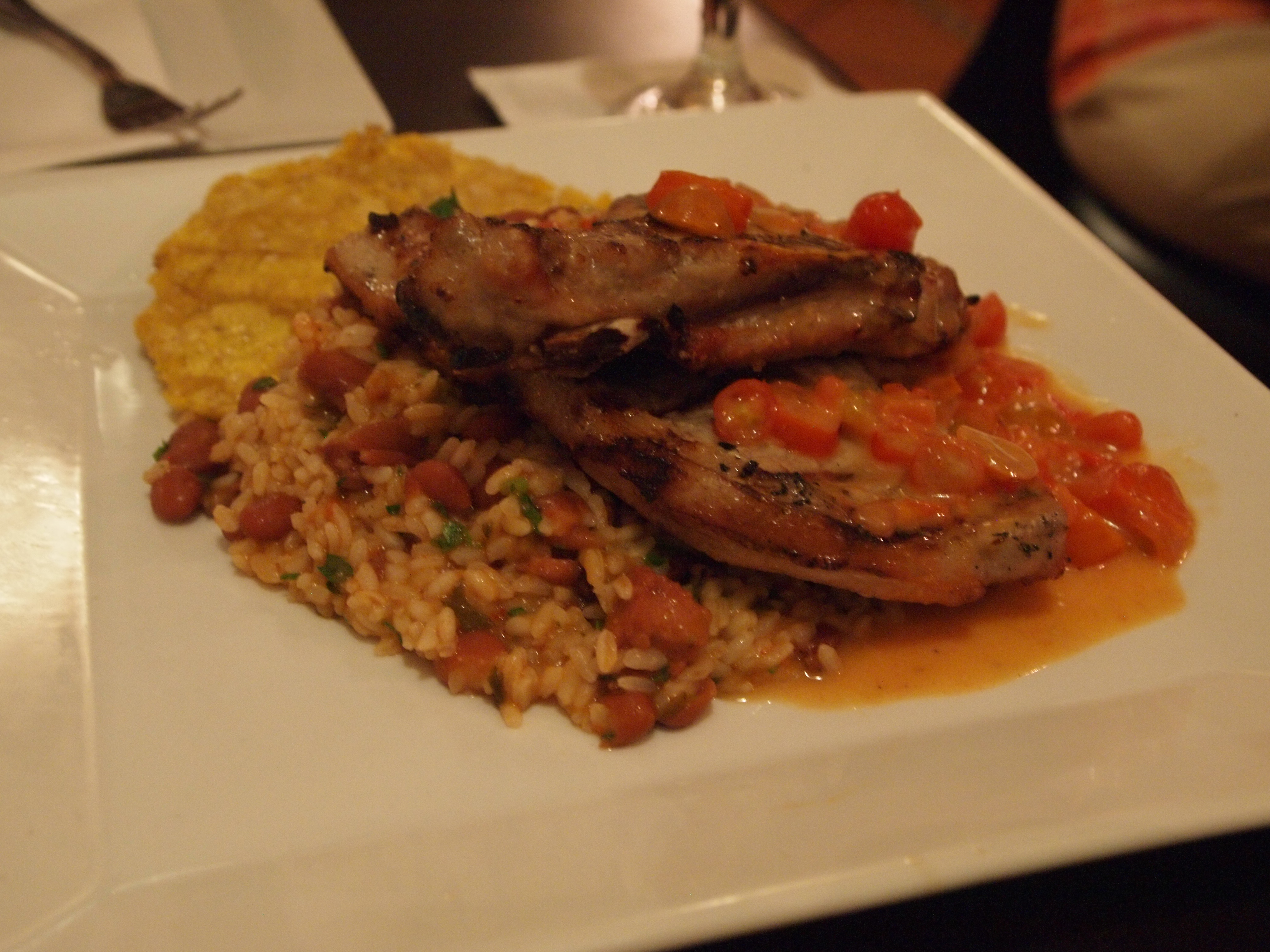 Lightly smoked pork with rice and beans and tostones. Wow, this pork was amazing! Porbably brined for at least one night. A subtle smoky flavor and very tender.