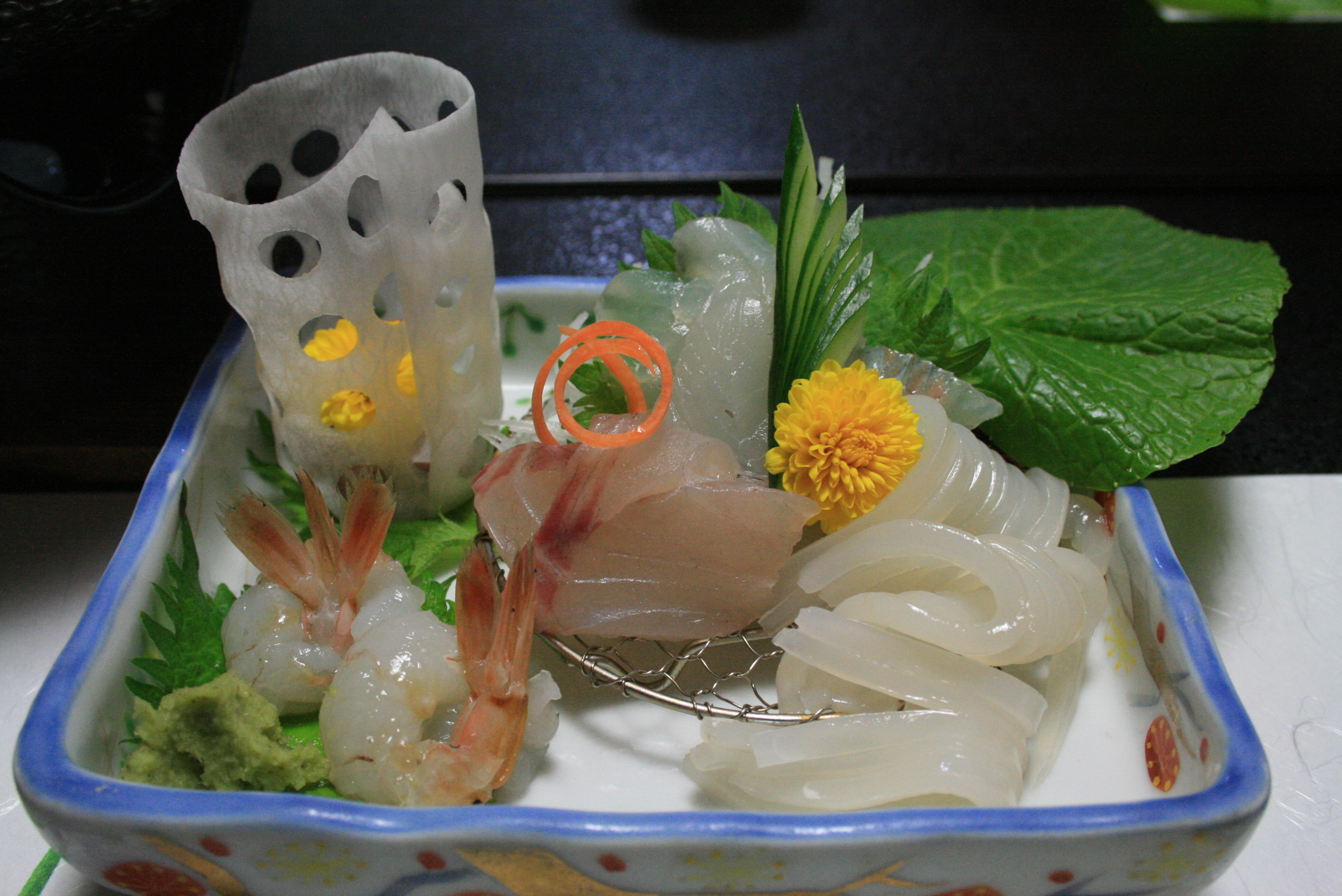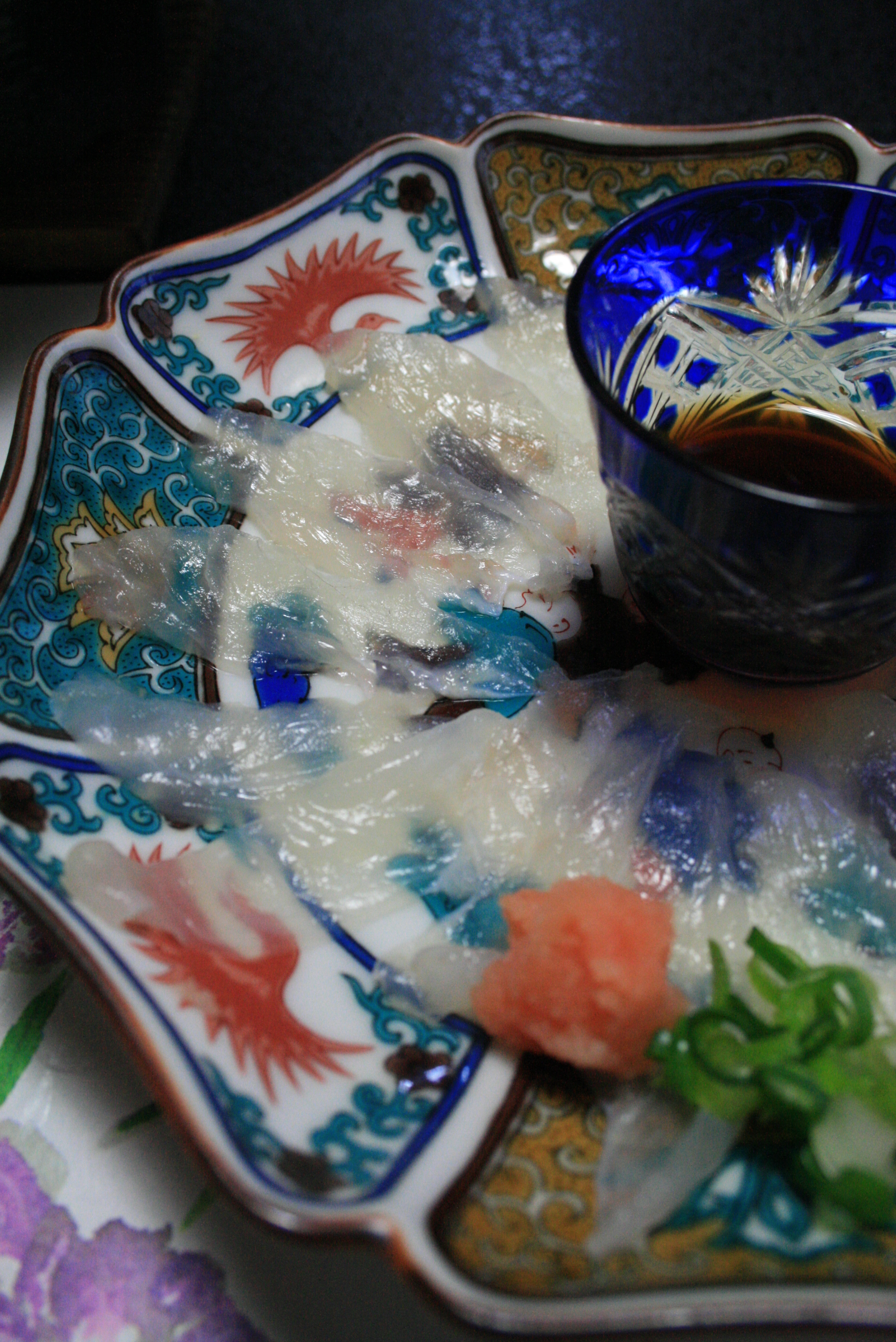 [Fugu (puffer fish) sashimi or usuzukiri (thinly sliced)- what a treat!]