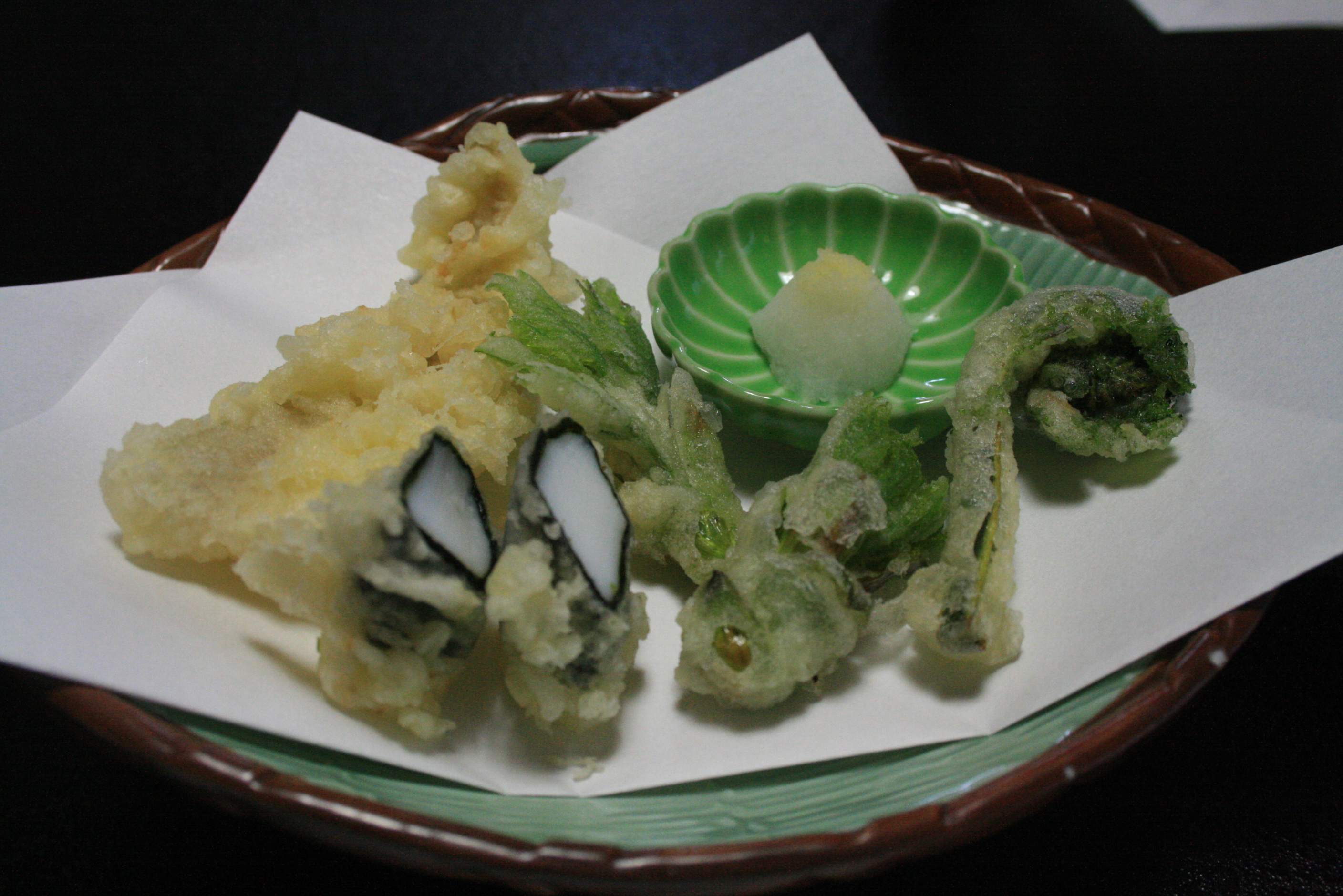 [Fiddlehead fern and nori wrapped squid tempura]