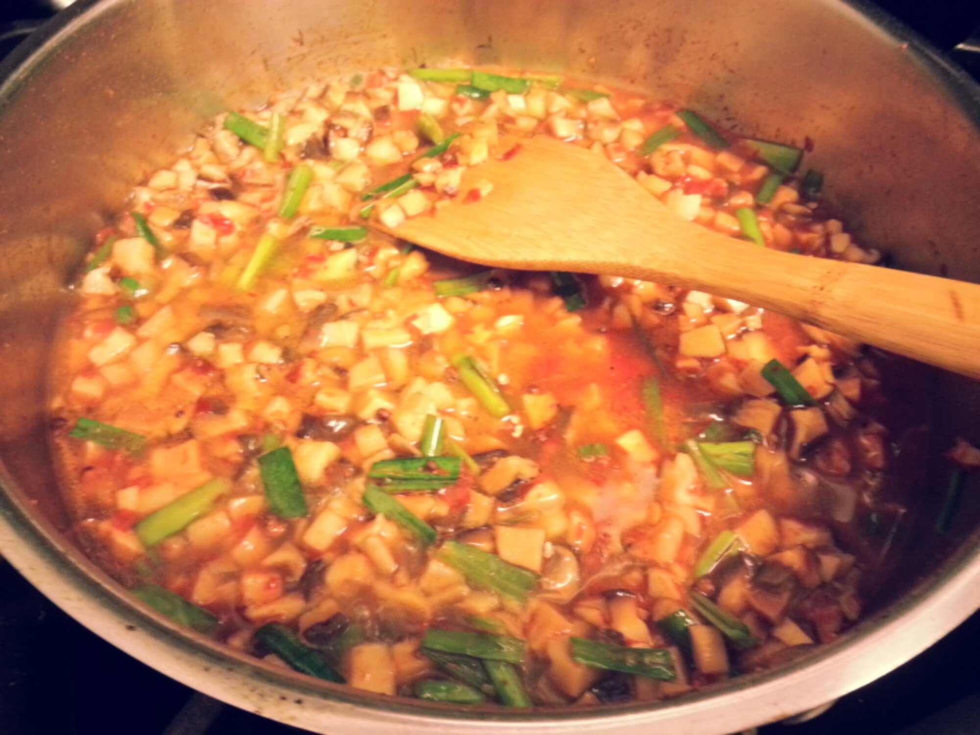 7.When you have reached the right consistency (not too thick but not soupy), add the scallion and finish with a bit of sesame oil.