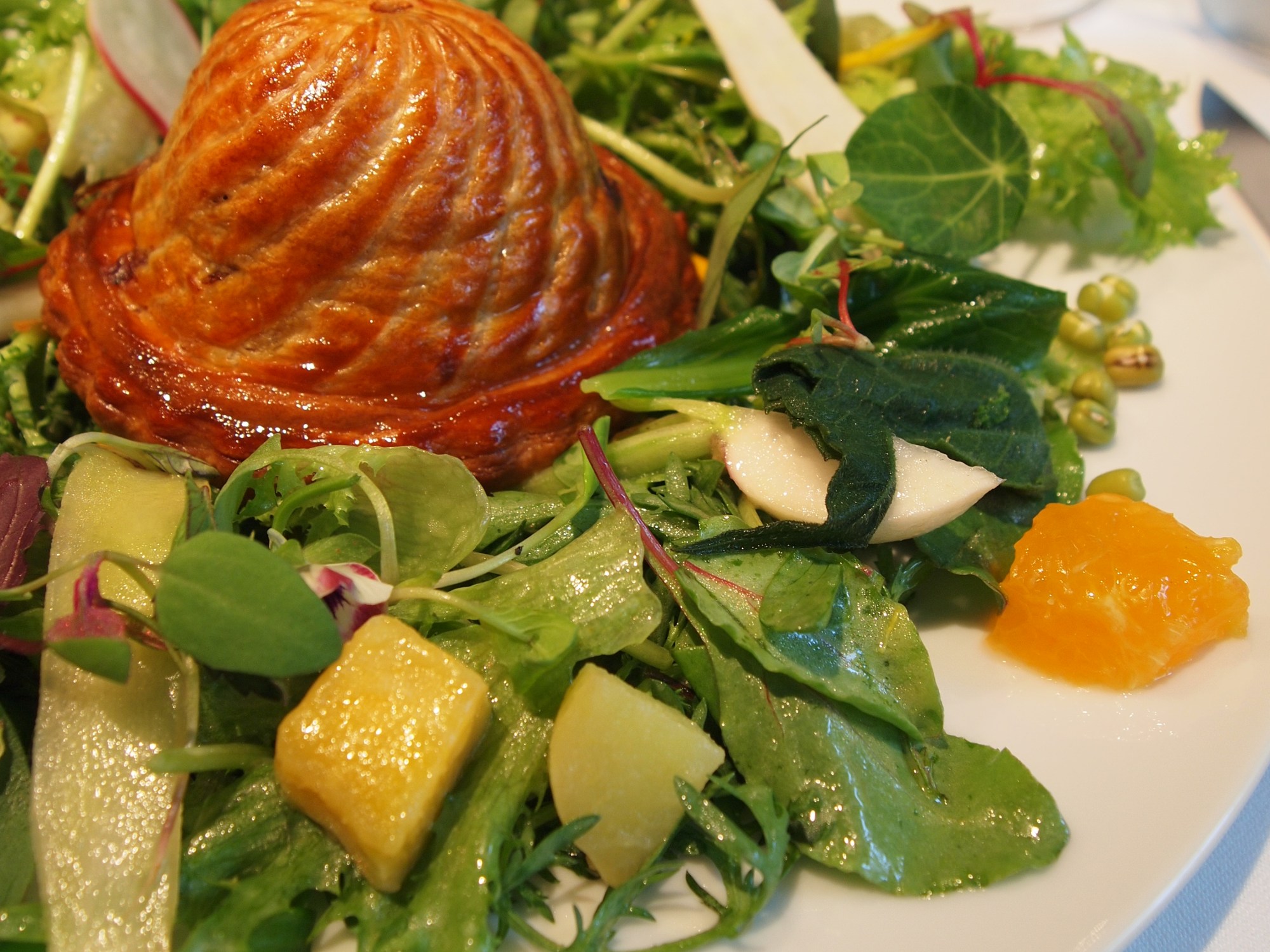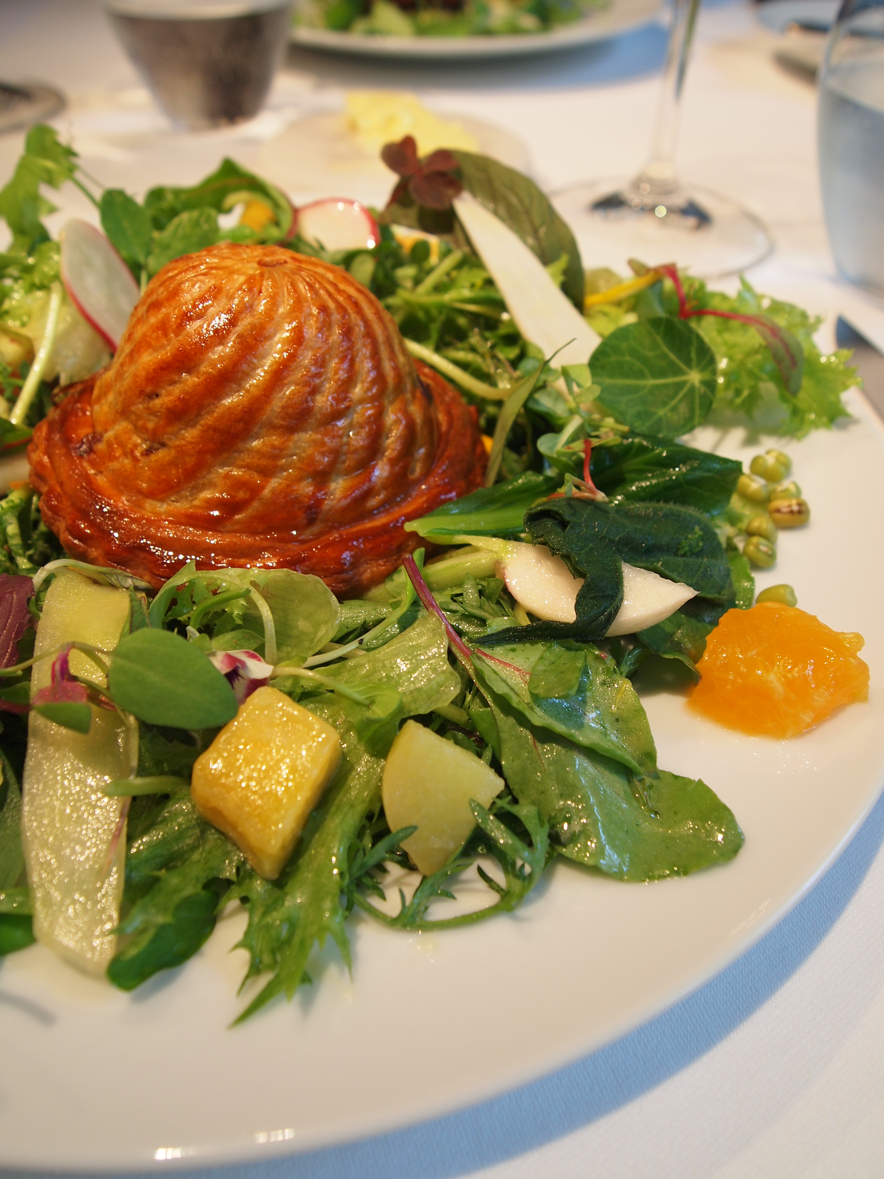 The main dish for both courses were mainly composed of vegetables. Mine was a version of an apple pie. I’ve read that Chef Namae creates different versions of the McDonalds apple pie because it has a special place in his heart? This day’s apple pie was filled with braised beef cheek (loved the gaminess), foie gras, shiitake and peaches. This pie sat in the middle of a salad that consisted of 65 different vegetables, herbs and fruit! Apparently this changes depending on what is provided to them. Every piece was dressed nicely and I really enjoyed this dish. The braised beef cheek was exceptional.