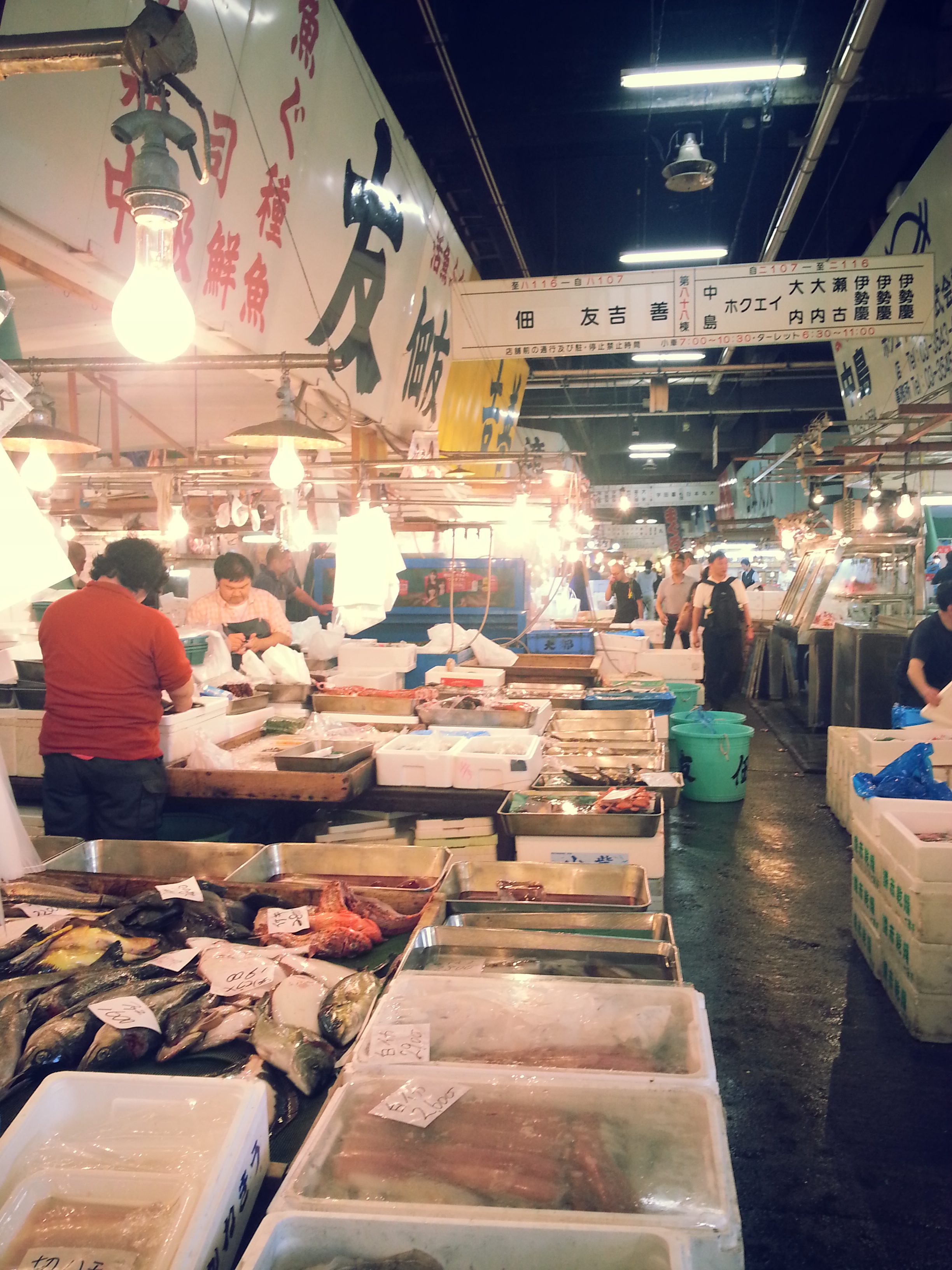 I’ve been to to Tsukiji Market numerous times but this was the first time I finally made it into the jounai (inside market). A few months ago I attempted to get a ticket for the tuna auction but those were gone by the time I arrived at 4:45am. I didn’t think it would be worth it to wake up even earlier for this (plus I’ve heard that they hate tourists observing the auction) so we just worked our way to the market at around 7:30am.