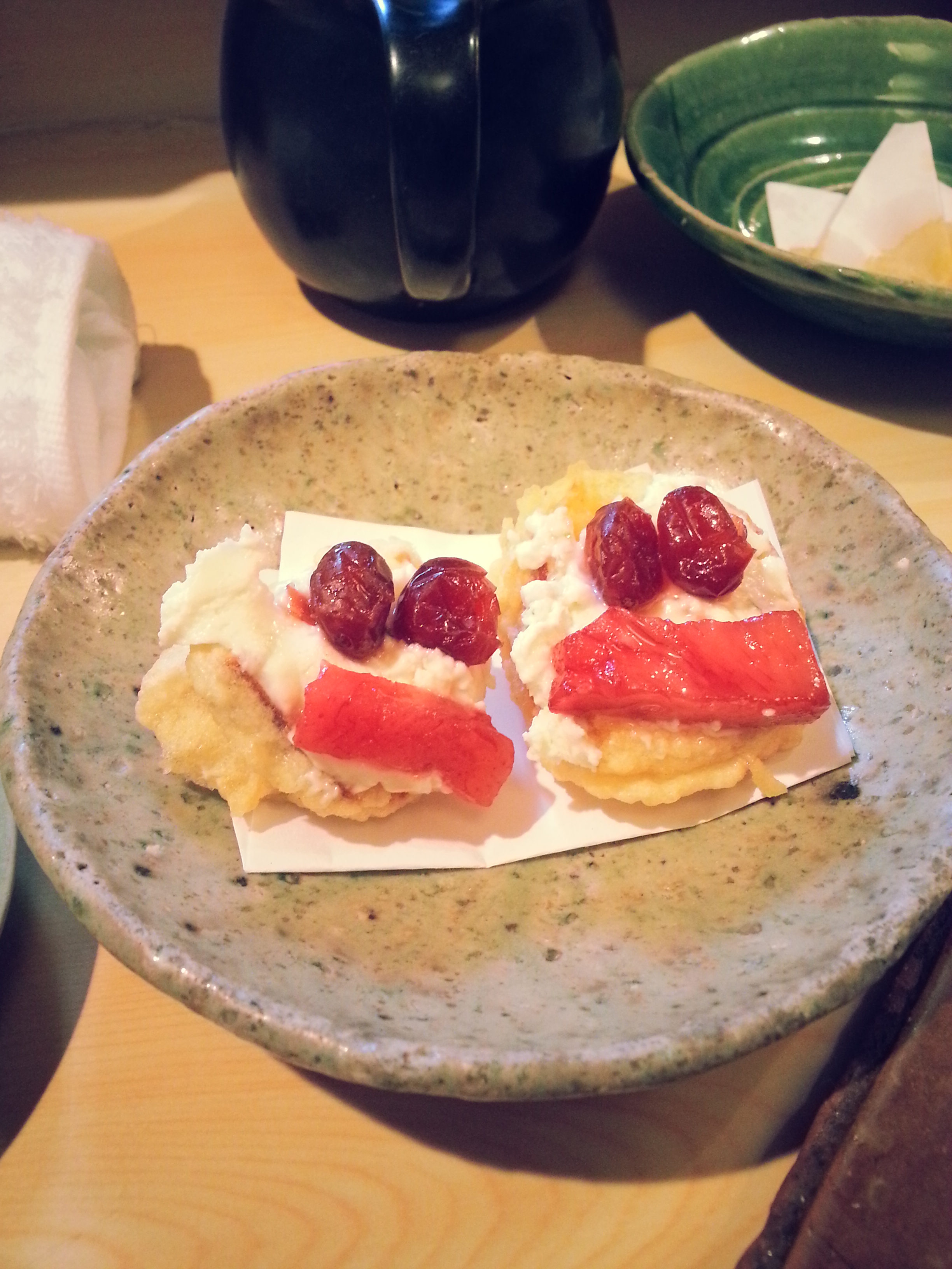 My favorite items that are available throughout the year, are the shrimp stuffed shiitake (which he minces and stuffs to order) and pon de queijo (glutinous Brazilian tapioca and cheese bread, which he fried and smears with some Boursin cheese!). At the end of the meal you have a choice between somen (noodles- the ones they use here are exceptional and retain a great texture, and his dashi is spot on), plain rice (served with kakiage- a tempura of shrimp and squid), ten-don (the kakiage is served on the rice and drizzled with tentsuyu) or ochazuke (the kakiage on rice has tea poured over it). The rice and miso soup here is just absolutely delicious. The miso soup is usually a shijimi red miso soup. This night we had about 5-6 seafood items and 5-6 vegetable items and we paid a little less than 5000 yen per person (this included all the other items in the course). Amazing! Definitely can’t get a deal like that in Manhattan!