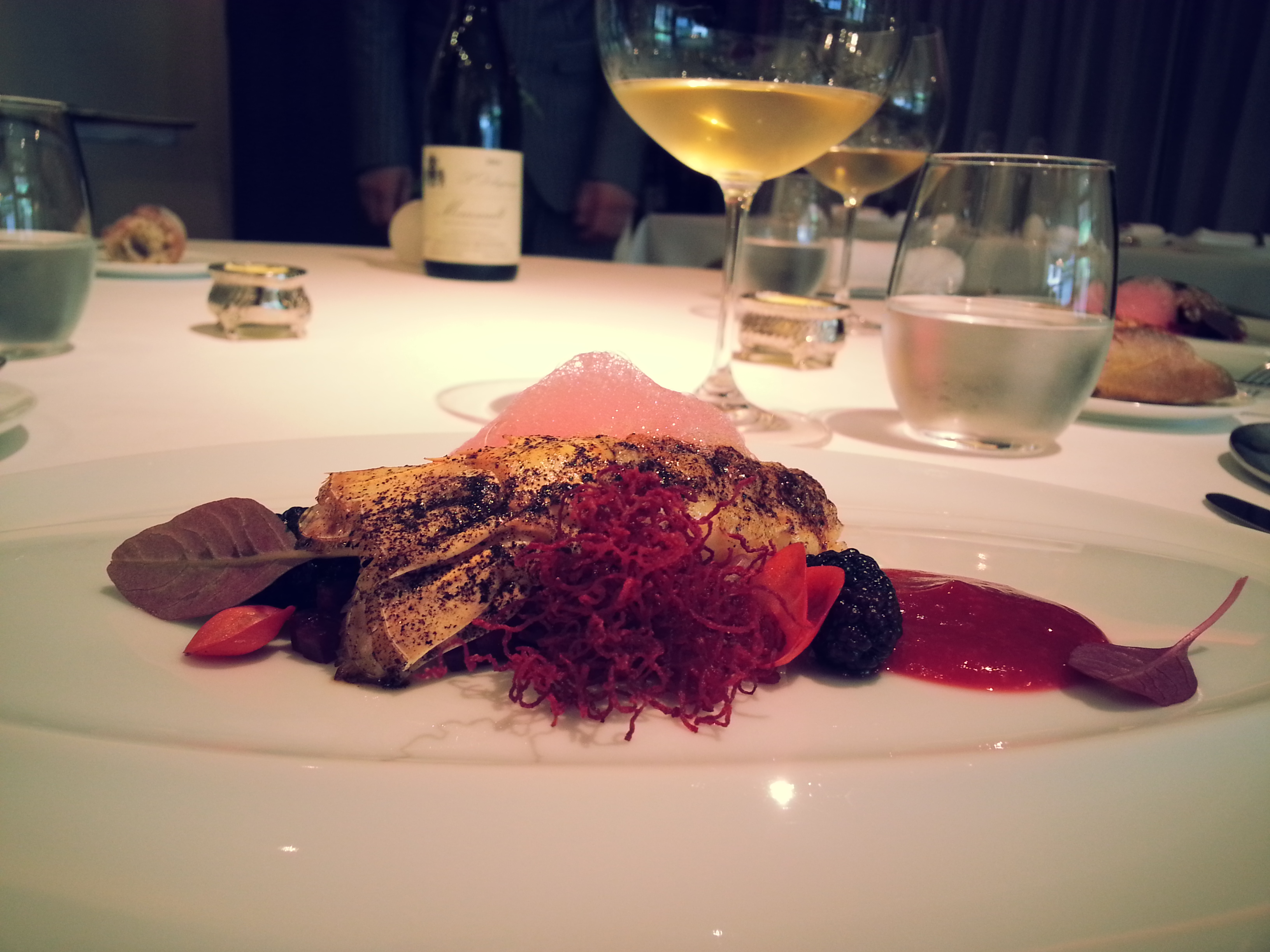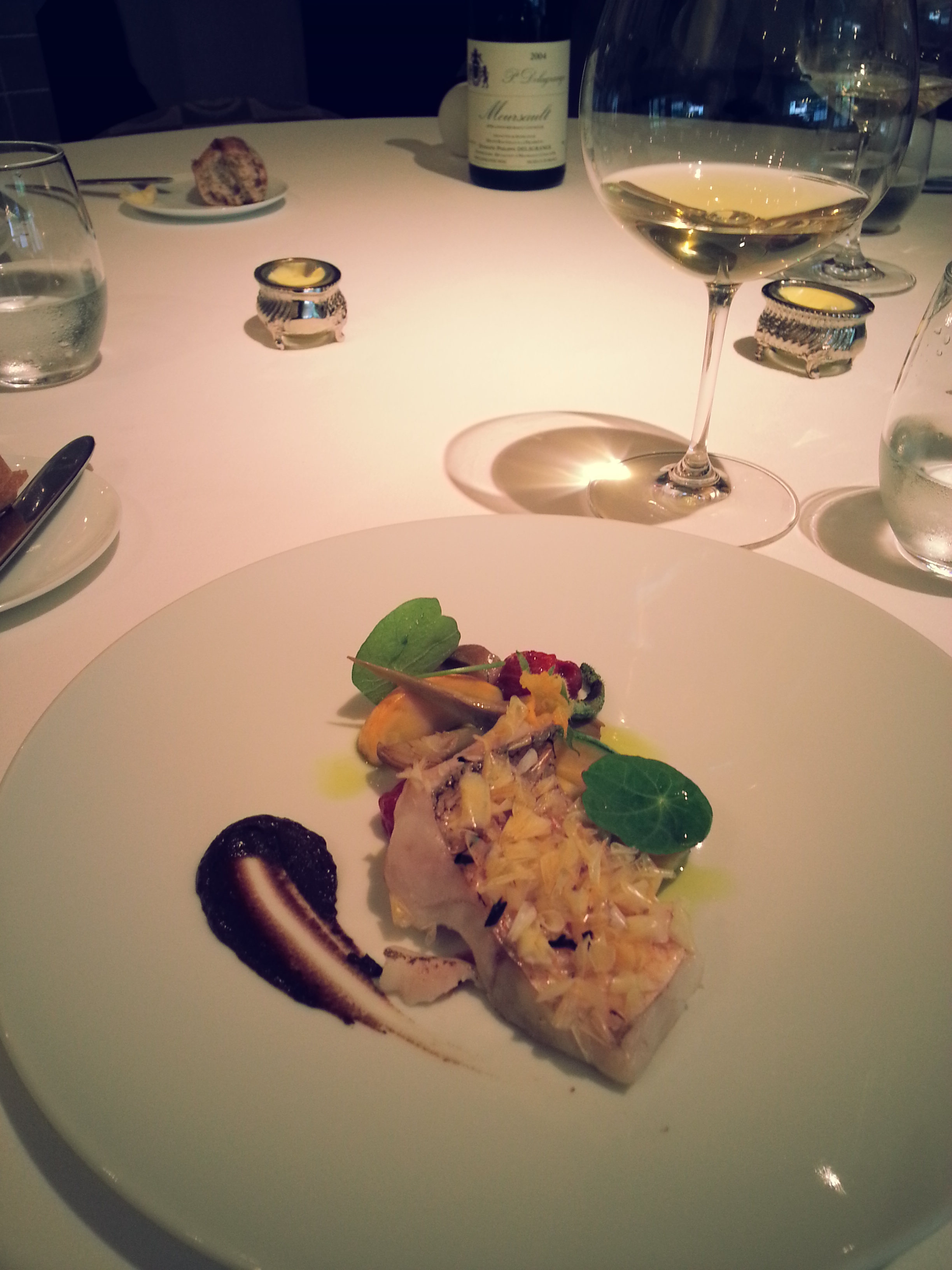 The first course was a smoked unagi (eel from New Zealand) served with a fromage blanc sauce and eggplant confit. Even my boyfriend who doesn’t like eggplant loved the eggplant (this happened with all eggplants that we had in Japan though :p). The sauce was served in a shot glass and we poured it over ourselves. Three little bites (eel rillette with lardo on crispy bread) were served with this dish. Apparently New Zealand eel is much bigger and a firmer texture, and it has a stronger flavor so it is better used in French cooking applications rather than in traditional Japanese cooking. He used three different smoking woods (at different times). I thoroughly enjoyed this!