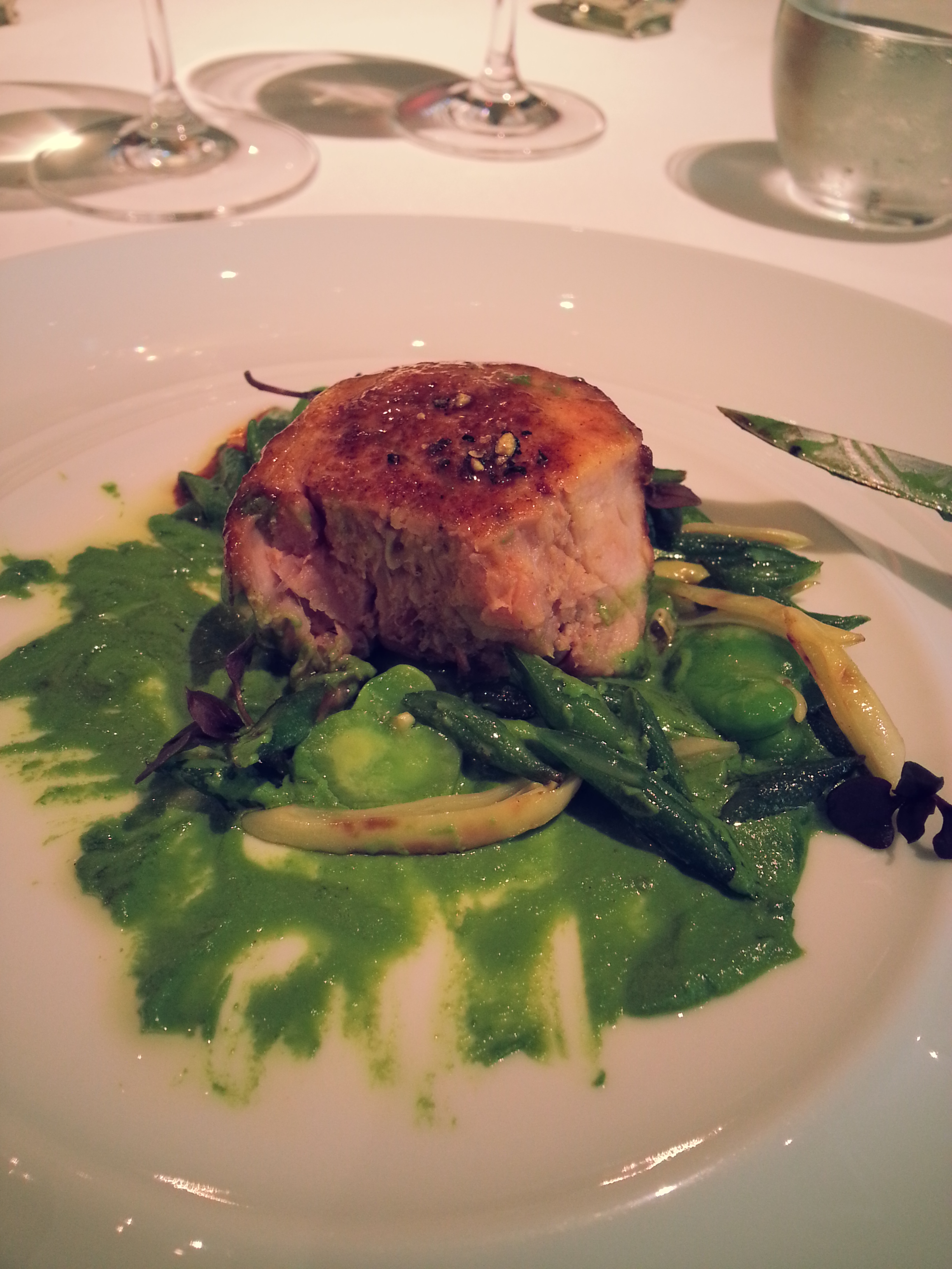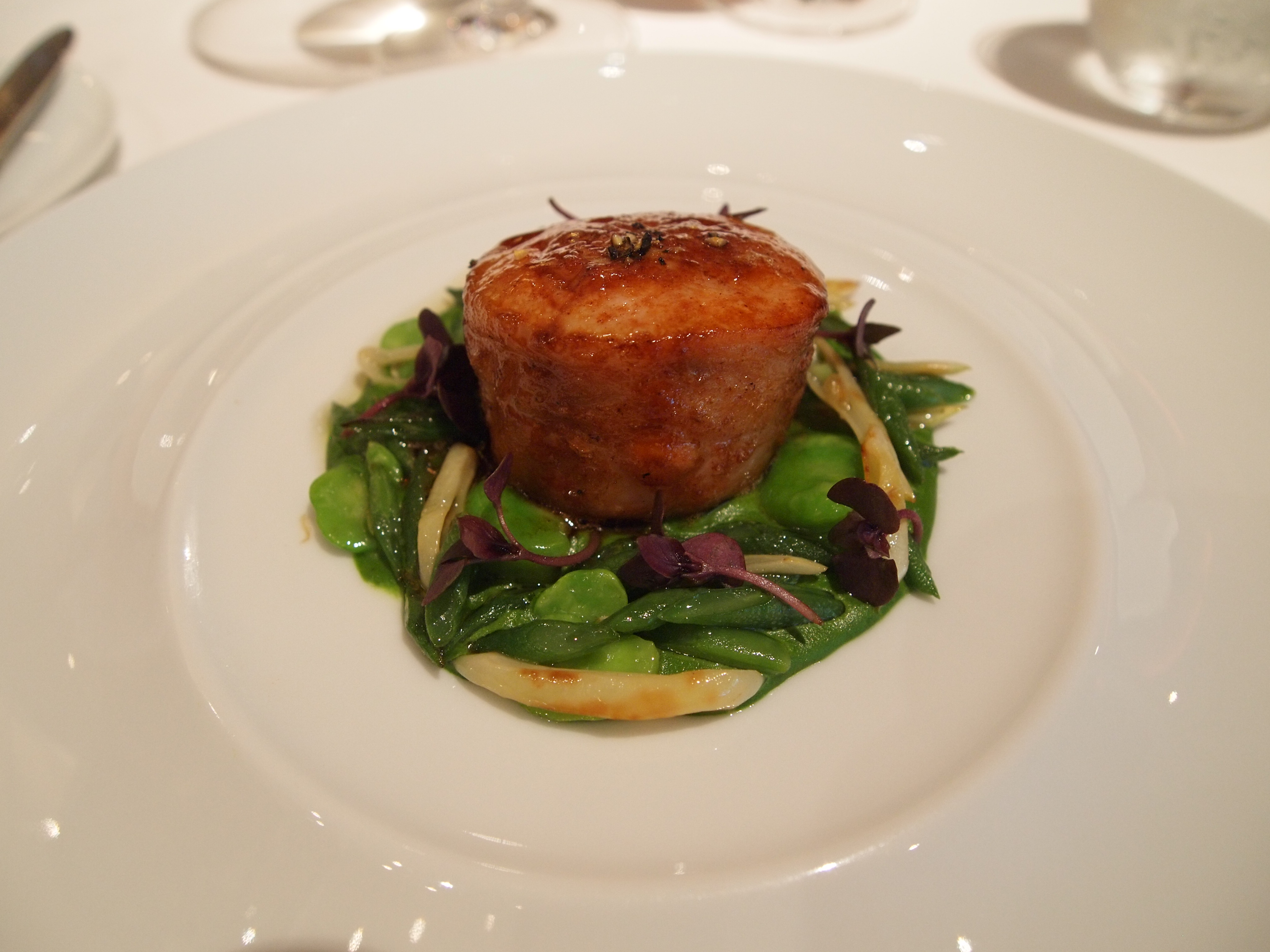 The meat course was possibly my favorite. Rabbit breast stuffed with minced rabbit and foie gras, served with seasonal beans. The texture reminded me of a well made sausage, and the flavors of the slight gameyness of the rabbit and earthiness of the mushrooms married well together. I absolutely loved the presentation as well.