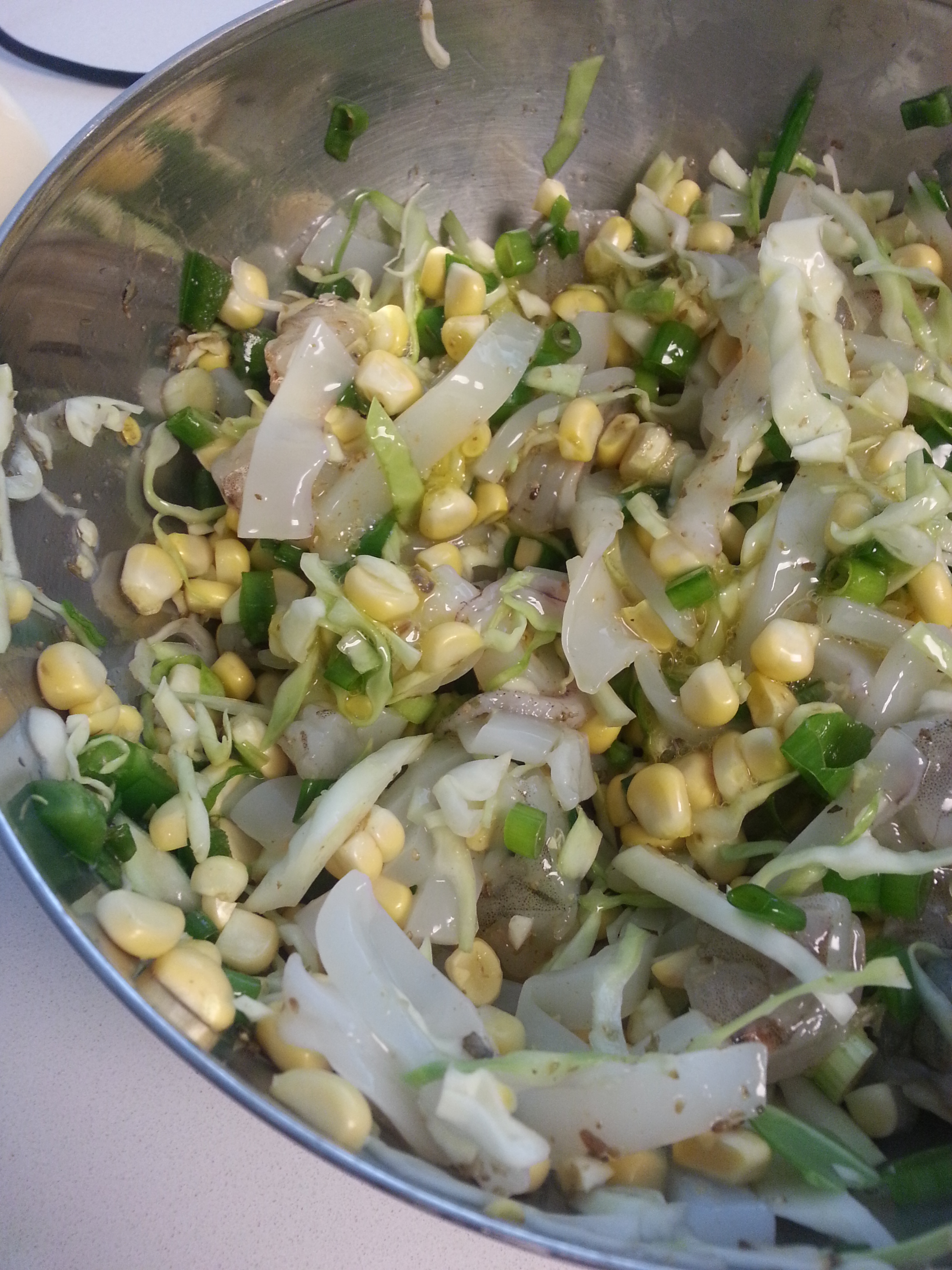 For this okonomiyaki, I put together some shredded cabbage (salt a bit to remove excess water), minced scallion, minced Jalapeno, corn, small pieces of shrimp and squid, and seasoned them with salt, pepper, cumin, coriander (ground with my mortar and pestle) and dried marjoram.