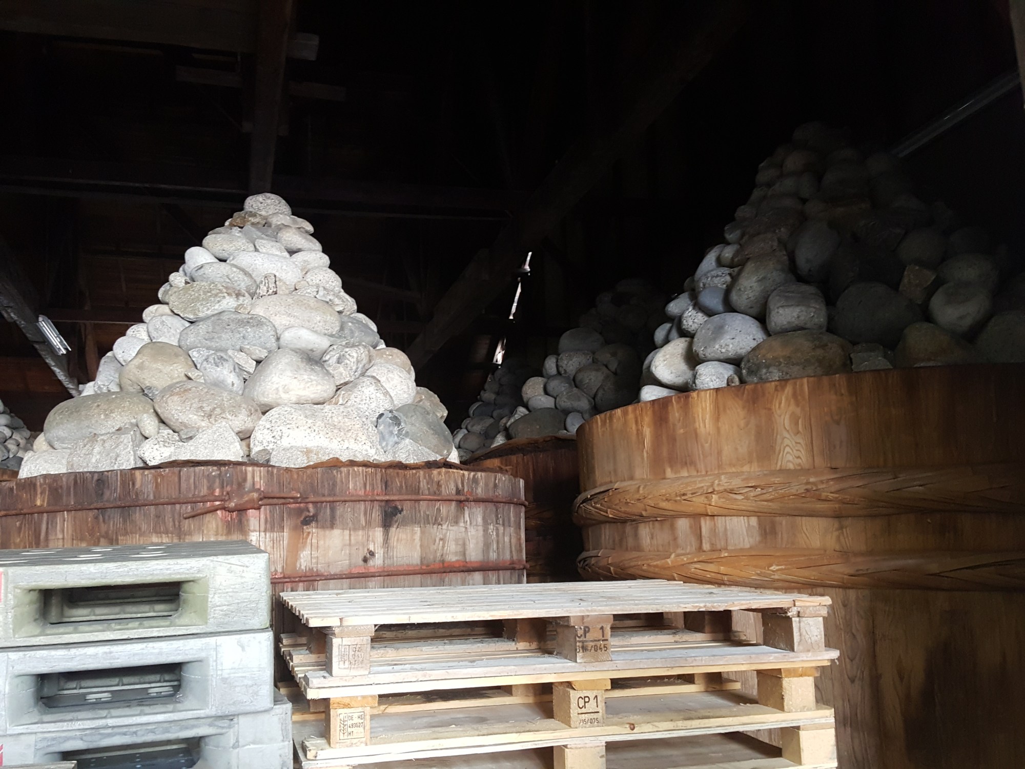 To make Hatcho Miso, the soy beans have to be steamed, formed into balls, then inoculated with Koji (takes four days). Images can be seen here. The Koji soy bean balls are then combined with sea salt and spring water, then placed in large wooden barrels. The craftsmen will then step on the soy bean mixture to pack them in and remove any air pockets. Once done, four tons of large rocks are stacked on top of the lid to pack in the soy beans even more and squeeze out the excess water (hence the lower salt content). The stacking of the rocks requires a lot of skill, and only a few people have these skills to carry out the task. It is then left to ferment and age for two years. The result is a very dense, earthy and Umami rich Miso. In my opinion, Hatcho Miso complements root vegetables, mushrooms and game meat, and it also pairs well with dark chocolate. I think it is a great ingredient that can be used in non-Japanese food to enhance Umami and add depth to braises and stews.
