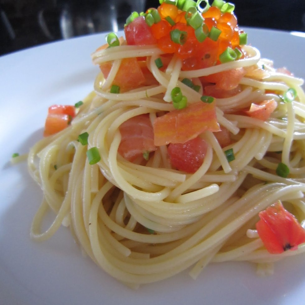 Aya’s Kitchen: Cold smoked salmon and salmon roe pasta with an heirloom tomato and lemon vinaigrette